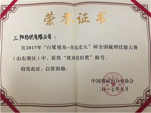 近日,公司組織企業員工參加2017年“白鯊境泉-青島宏大”杯全國梳理技能大賽(山東賽區),經過激烈角逐,我公司獲得“優秀組織獎”稱號,我公司員工李永生、董建軍榮獲“梳棉技術拼搏能手”稱號。本次大賽是對我公司員工操作技能水平的檢驗,同時也是我公司員工踐行“工匠精神”,對自身技能精益求精,勤學苦練的結果。